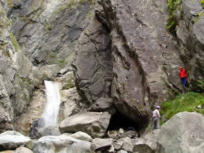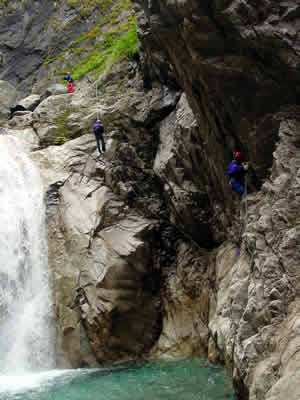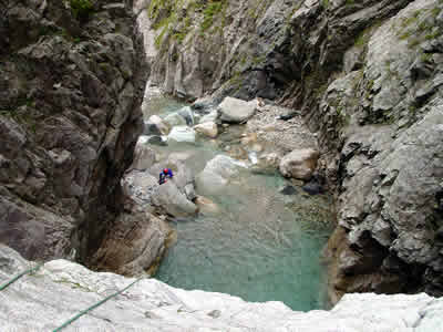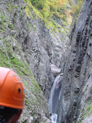 池ノ谷ゴルジュはまだまだ先ありますが、すべてがデタラメでこれ以上手が出ません。 F1(入口の滝)まで戻り懸垂で下りることにします。 |