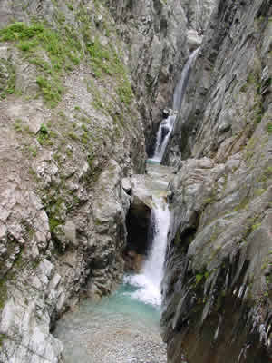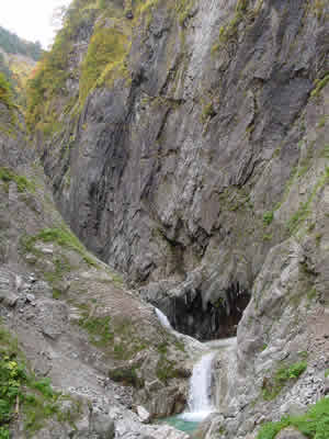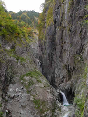 なんじゃいこりゃ〜。想像を超えてます。 滝は記録によると[奥ノ滝](F5)で50m。 池ノ谷ゴルジュ最大の滝。 |